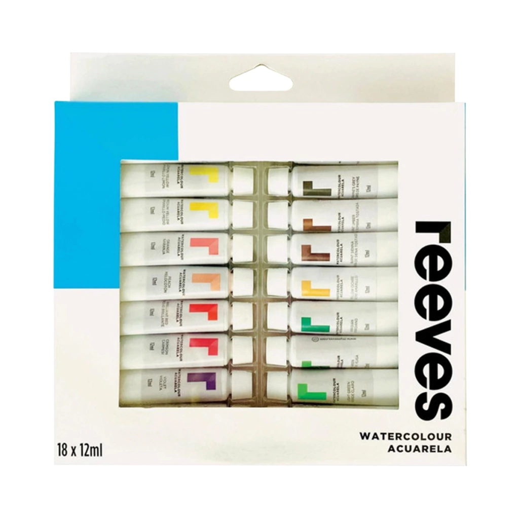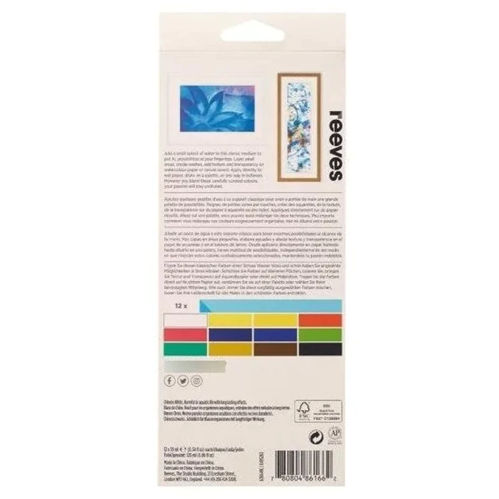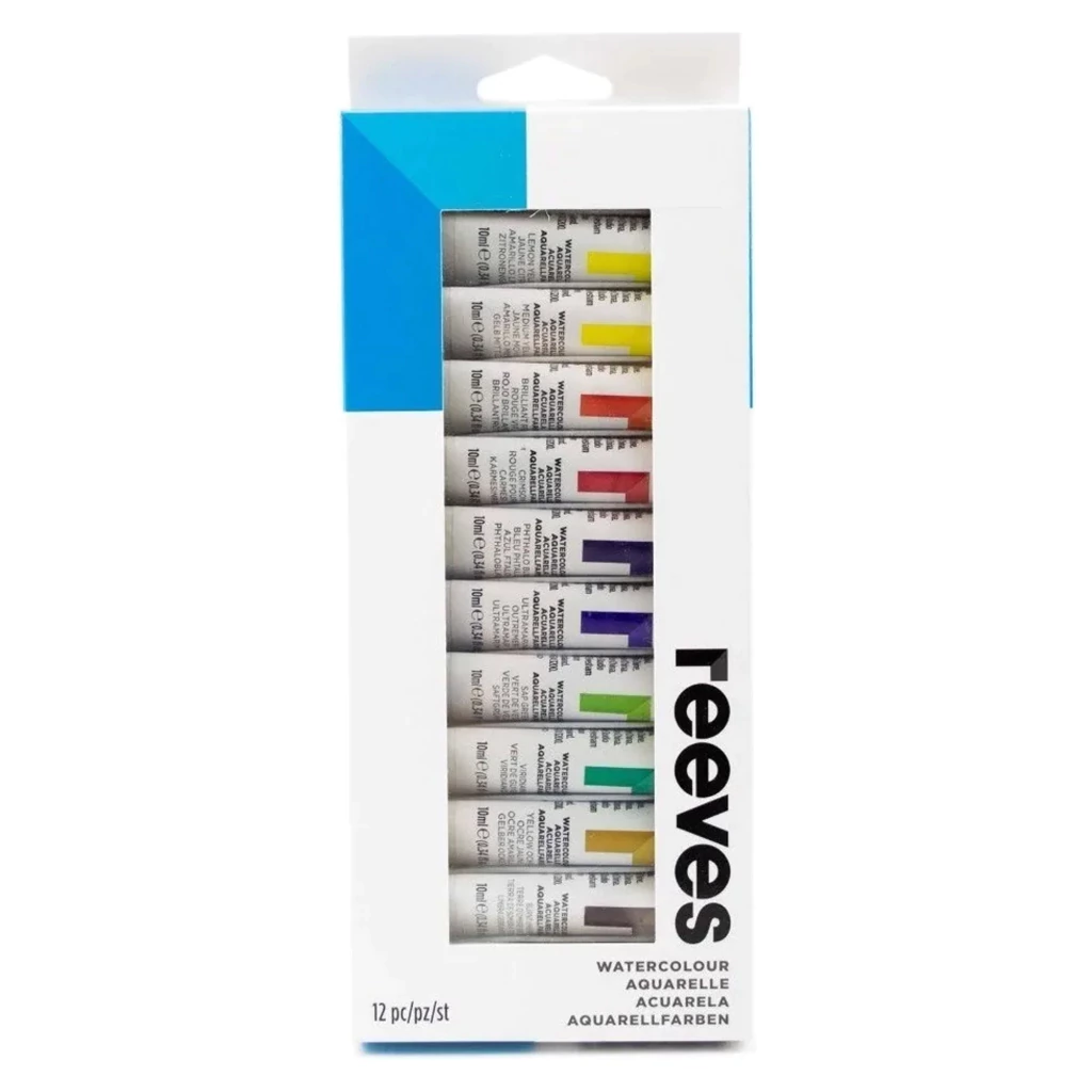 Las acuarelas Reeves están elaboradas a partir de pigmentos de alta calidad, que le brindan a tus obras excelente resitencia a la luz, trasparencia, solidez y fácil manejo. Este set incluye 12 colores en pomo de 12 ml: Blanco de China , Amarillo limón, Amarillo medio, Rojo brillante, Carmesí, Azul ultramar, Azul ftalo, Verde vejiga, Viridiano, Ocre amarillo, Tierra de sombra tostada y negro de marfil.