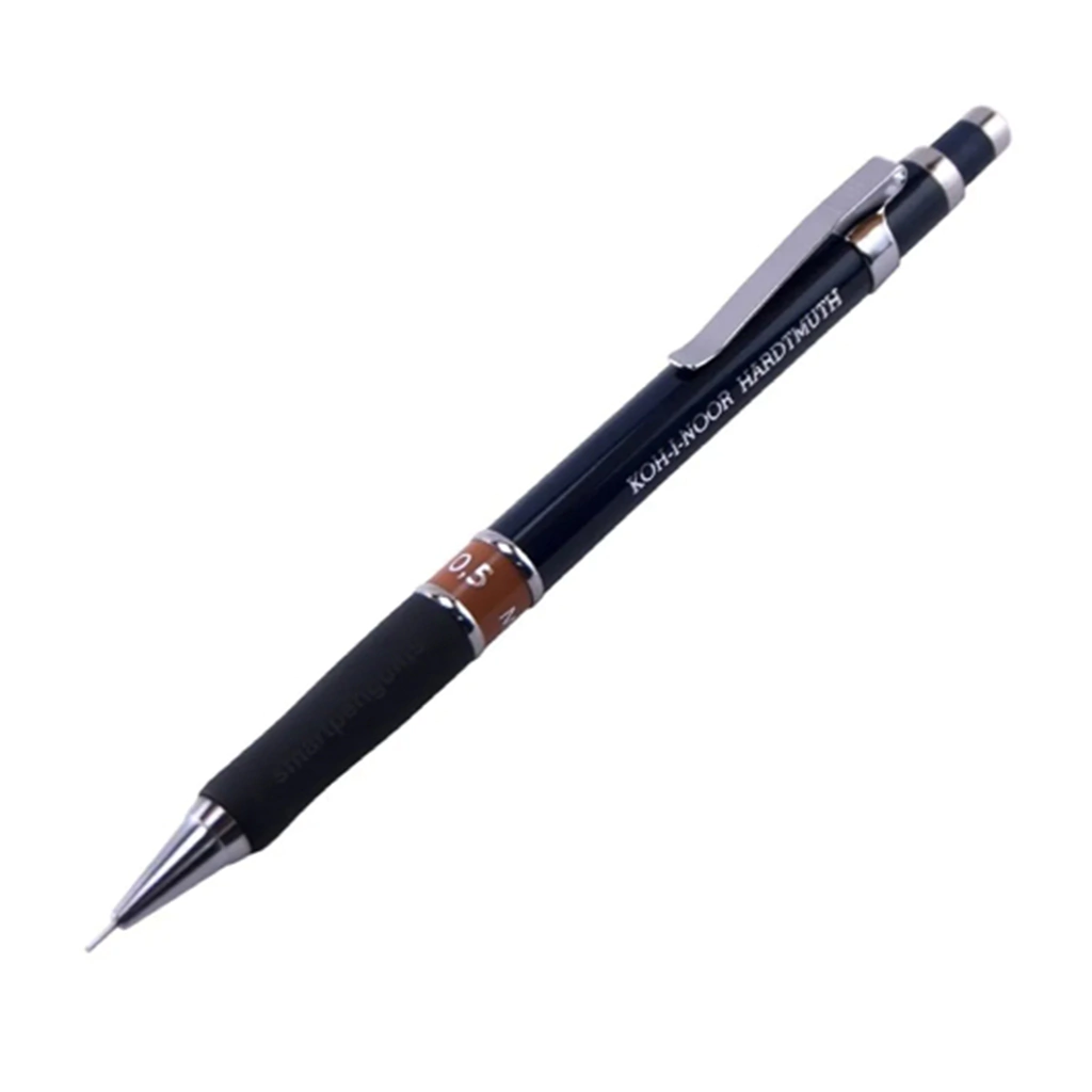 Portaminas Profi, combinación de metal y plástico, se utiliza como portaminas para escribir, redactar y dibujar, mina de 0,5 mm. El cuerpo de color azul oscuro, anillo de color amarillo, empuñadura de goma, extensión de goma giratoria. Incluye clip de metal.