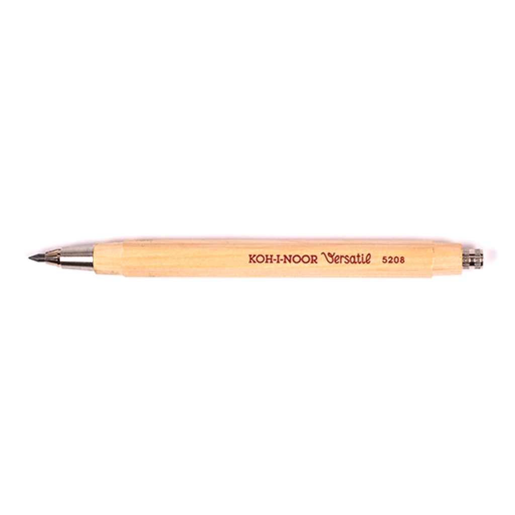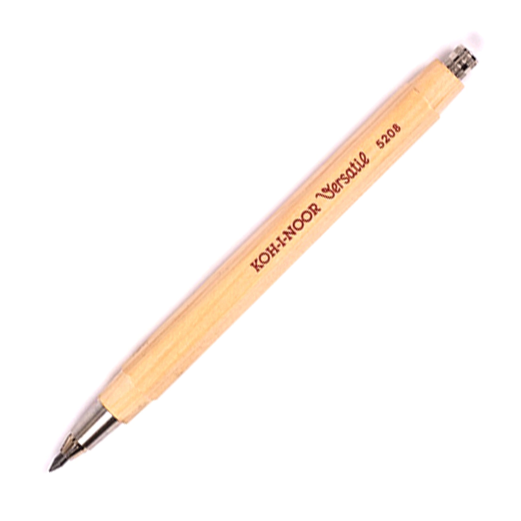 Portaminas con combinación de madera y metal para escritura y dibujo, con mina de 2,5 mm. Al presionar el botón en la posición inclinada del lápiz y abrir el collar, el lápiz se mueve por su propio peso a cualquier posición. En el pulsador, que se desenrosca, hay un volquete para afilar el lápiz. El cuerpo es de madera hexagonal, mecanismo de metal. No viene con clip. Color marrón claro.