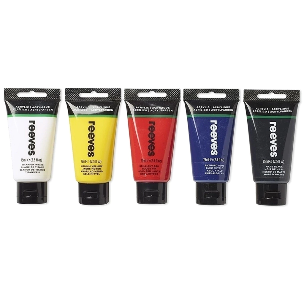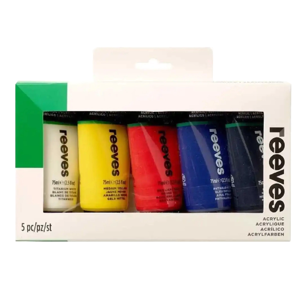 Set de Acrilicos Reeves 75ml X5 Colores. Las pinturas acrílicas Reeves son perfectas para estudiantes y artistas. Altamente pigmentadas, flexibles cuando están secas y se pueden limpiar fácilmente con agua. Excelente cobertura, adecuada para una variedad de superficies que incluyen lonas, papel, madera, vidrio y más. No tóxico