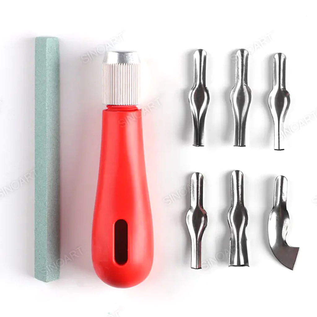 Set Para Grabado Sinoart Mango + 6 Gubias. Mango de plástico, incluye 6 cuchillas. 1 piedra de cuchillo adicional incluida. Ideal para tallar linóleo, Speedy Cut, Speedy Carve y otros sustratos duros y blandos. Ideal para tallar calabazas con mucho detalle. Está hecha de plástico duro y tiene un agarre cómodo. El extremo desmontable es perfecto para guardar los cortadores de linóleo. El portabrocas de metal ajustable a mano hace que cambiar los cortadores de linóleo sea muy rápido y fácil. El mango giratorio ofrece un almacenamiento cómodo.