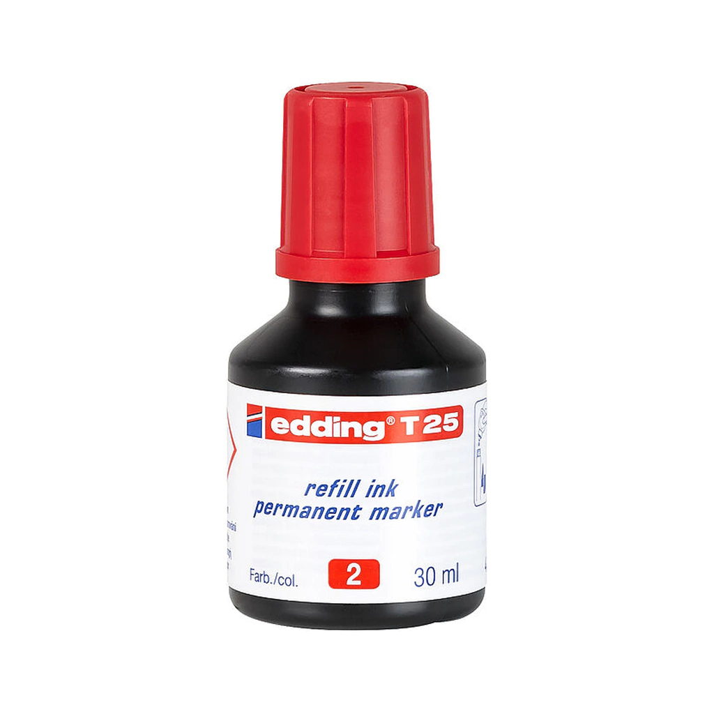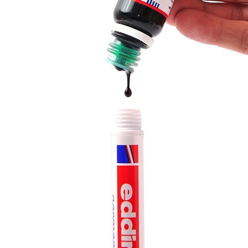 Tinta permanente de recarga de 30ml en color rojo y negro. 20ml en verde y azul Frasco con sistema de goteo. Para recargar los marcadores permanentes edding 300, 330, 400, 390, 850, 3000 y 3300. También se puede aplicar directamente con un pincel, plumines, plantillas o sellos. Recarga recomendada: no más de 10 gotas por marcador. Color: rojo.